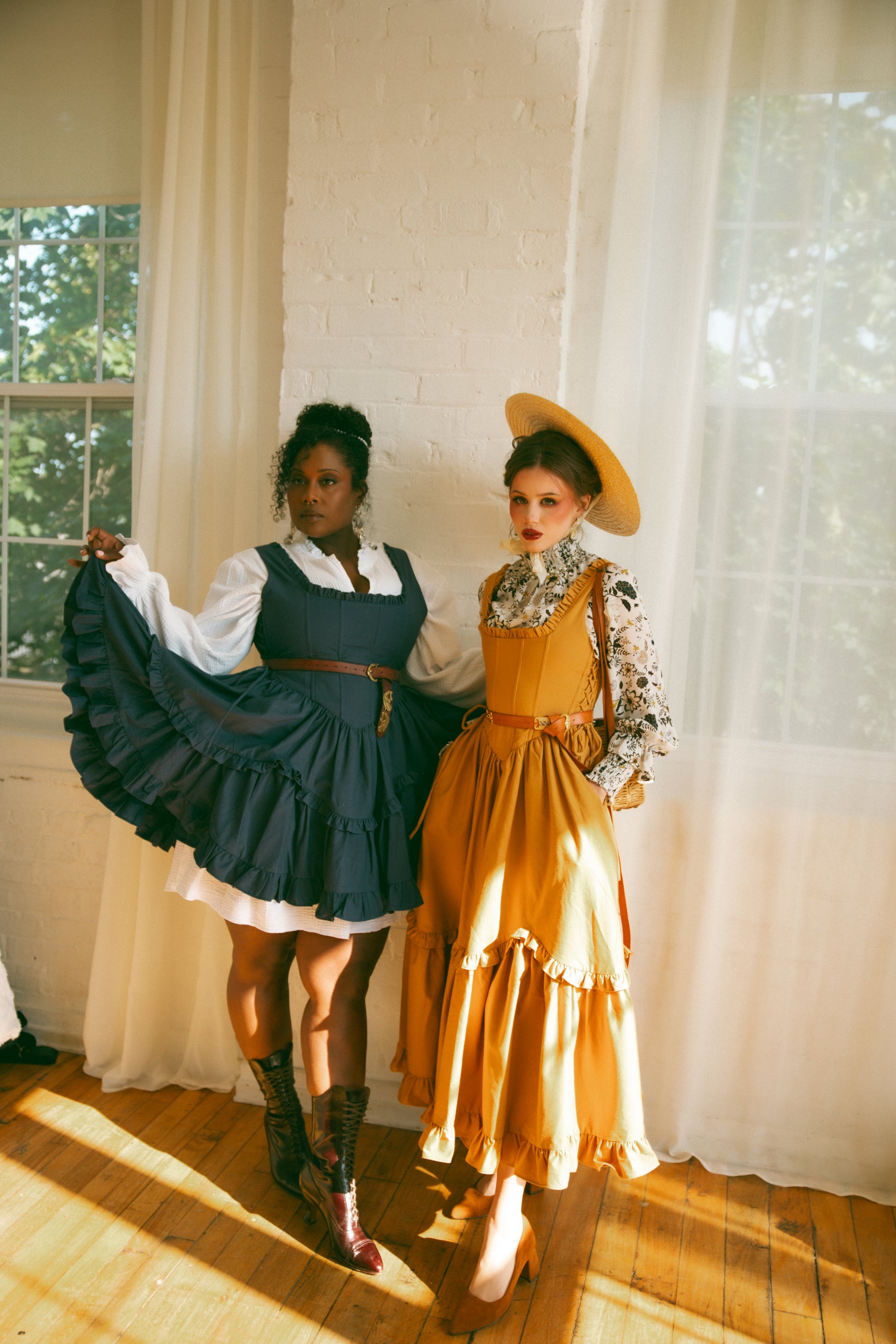 The Carmilla Dress is my take on a Rococo inspired cottagecore dress. There are so many details, like the ruffle around the square neckline, the structural boned bodice that we kept from the Diana design, and the full circle skirt with not just the mid-skirt detail ruffle and extra gathered tier, but also a hem ruffle for more detail and flounce.