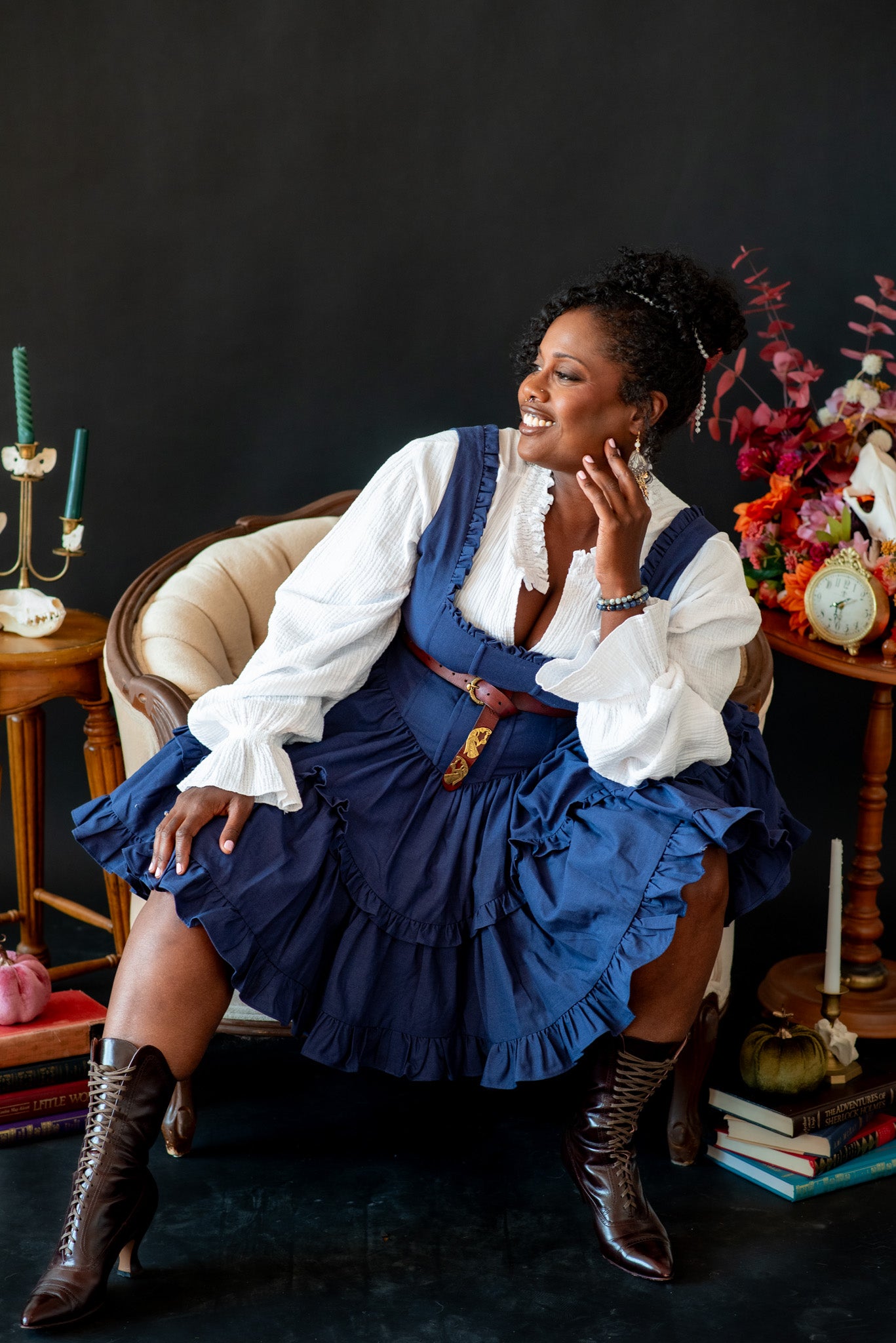 The Carmilla Mini Dress is all the Rococo inspired cottagecore dress details you love in the Carmilla, but in a whimsical shorter package. There are so many details, like the ruffle around the square neckline, the structural boned bodice that we kept from the Diana design, and the full circle skirt with not just the mid-skirt detail ruffle and extra gathered tier, but also a hem ruffle for more detail and flounce. We also can't forget the side seam pockets!