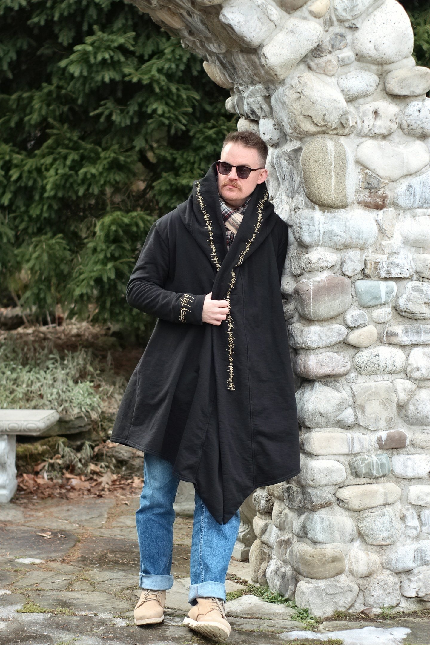 The Sylvie Jacket has an angled hem for beautiful sweeping garment lines, big side seam pockets, and a wonderfully dramatically large hood. All topped off with embroidered detailing in one of two options: one which reads "fantasy nerd" around the collar, hood, and cuffs, all in a stylized elvish inspired font. The second option is a trailing vine embroidery on the same areas.