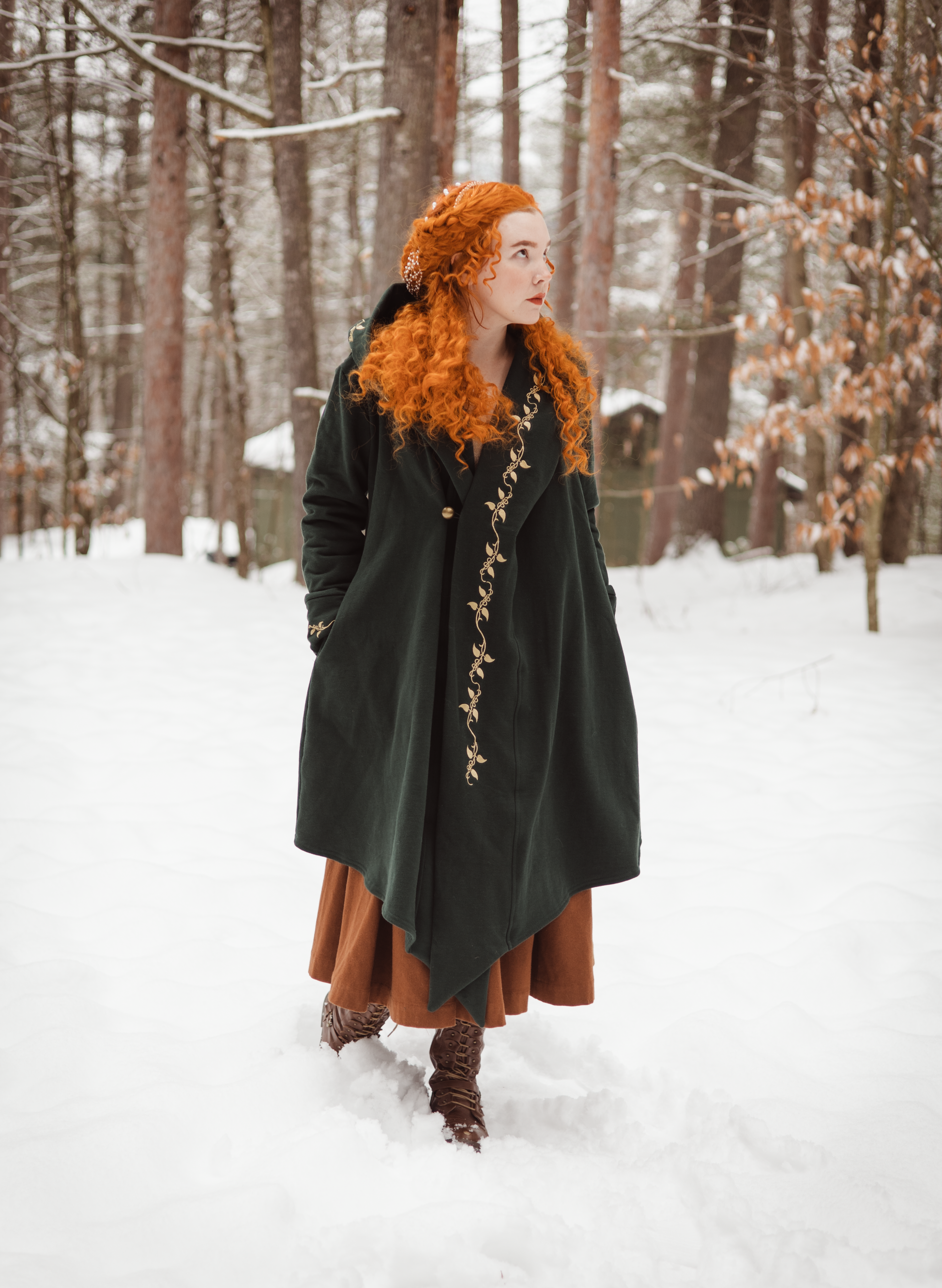 This modern fantasy outerwear piece is made from 100% cotton terry fleece, the fabric is custom woven in Quebec Canada, the jacket is manufactured in Toronto, and the embroidery and finishing details are completed at the Valkyrie Custom Wear studio.